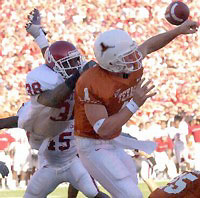 The Dallas Cowboys have just selected an Oklahoma Sooner - Mr. Roy Williams - as their first round draft pick. You go Royeeee! You will notice upon close inspection of the above photo that Roy's legs are not visible. That's because he was airbound. You will also notice that Chris Simms is facing the wrong way in his own endzone. That's because he was just about to complete a perfect "pass" to OU's Teddy Lehman for a Sooner touchdown. Roy's going to be a thing of beauty to watch in the NFL. Keep your eye on 'im!