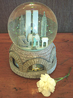 I can still remember him pressing up against the glass in the viewing area as I stood far, far behind the rail -- terrified of the height. And to think that fear I felt was nothing compared to what went through the minds of those who stood there after me six years later... So many other bloggers can say it better. So on September 11th, I won't be saying anything at all. All I can really offer to show my respect to this day and those who were lost doesn't come in the form of a Hallmark. It comes with my silence. May the God I believe in with all my heart keep safe and protect us all, and comfort those who will never stop hurting. beautiful. ¤ ¤ credit: laura | 09.09.02 at 03:57 PM | link-i'm going a different route. i won't change my blog schedule. this is not meant as a disrespect to any of those who lost their lives during the tragedy. sure, i will take time to remember, to ponder. but that will be on my own time. in my own way. ¤ ¤ credit: mikey | 09.09.02 at 05:09 PM | link-I think that's the only way, honestly Mikey (doing what's best for you) -- no two people cope with things exactly the same. And no way of remembering is 'better' than another, regardless of what MSNBC and FOX News would try to have you believe... ¤ ¤ credit: robyn | 09.09.02 at 05:12 PM | link-beautiful post - you have eloquent thoughts, and I'm glad you are taking your own time to just be reflecting tomorrow... btw, I almost bought a snowglobe just like that when I was in NY the 2nd time, and I wish I had. ¤ ¤ credit: kristine | 09.09.02 at 05:14 PM | link-i actually thought of doing the same -- but then i realized it would be so much harder to get through without the outlet of blogging, without the connection to my friends out there. i think it is a beautiful gesture to have that 'day of silence', i'm just ... not that strong. ¤ ¤ credit: kd | 09.09.02 at 06:02 PM | link-Here in Australia, they're asking people to turn on their headlights or light a candle at 8:45am, all well and good, but over here that's not when it happened. I'm going to be commemorating late at night. I remember vividly someone ringing us after 11pm and telling us what happened and we just sat in bed watching as the first and then the second towers collapsed. I'm not sure if I'll blog or not, I haven't really decided, but my thoughts will be with all those brave civilians who helped out (including the FDNY & NYPD) and the people on the other plane who stopped something even more tragic happening (wherever it was heading). It's a day in history I'll never forget and I will always treat it with the respect it deserves. ¤ ¤ credit: Jessica Parker | 09.09.02 at 07:12 PM | link-I think I will be silent that day. I have said (and will continue tomorrow) to say more than any person should really be saying on the subject. It has been cathartic for me. I plan on just posting a few pictures that day of some of my dad's colleagues that died that day and leaving it at that. Maybe. ¤ ¤ credit: michele | 09.09.02 at 07:39 PM | link-I love your globe. Its very beautiful and moving. ¤ ¤ credit: Camille | 09.09.02 at 09:51 PM | link-What a beautiful post. You're saying what I feel but can't get out... I'll never forget. ¤ ¤ credit: christi | 09.10.02 at 12:56 AM | link-i feel the same as kd -- i need to blog and surf because i need that sense of community, to feel in touch with others, and i need to express myself. it's the best way i know how to deal with it... otherwise, i feel as if my brain my explode. ¤ ¤ credit: zuly | 09.10.02 at 12:24 PM | link-Rob, your grandfather also worked at the World Trade Centers when he lived in NY, and when he went back on business trips. His first office was in the building that was there BEFORE the Trade Centers were built. Just thought you would be interested in that. I work at a military installation, it's been suggested here that we all wear red, white and blue to work, and at noon all stand and say the pledge of allegiance. I like that idea, just a suggestion some of the rest of you might like too. May God Bless America. And remember, that without God, we are just One Nation Under. My prayers go out to those who lost loved ones and friends that day. ¤ ¤ credit: Robyn's Mama | 09.10.02 at 01:27 PM | link-I did`n put even a single word to my website. I decided to spent that day in web silence .. ¤ ¤ credit: djfretka | 09.12.02 at 01:40 PM | link-